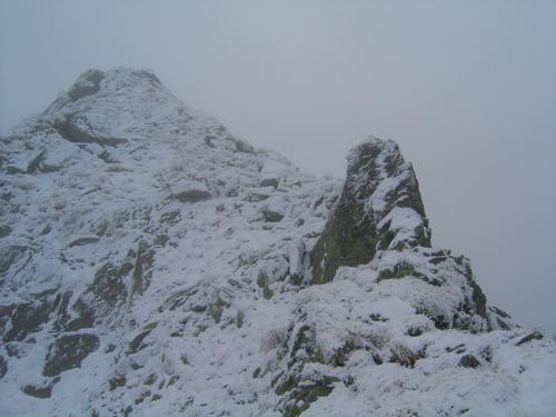 | Auch wenn man es auf diesem Bild nicht erkennen kann - die letzten 20 Höhenmeter sind ausgesetzt mit einigen leichten Kletterstellen (Schwierigkeit I). Heute bei Schnee und vereisten Felsen eine nicht zu unterschätzende Herausforderung |