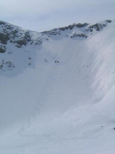Einige Wagemutige wedeln den Steilhang direkt unter dem Gipfelkreuz hinunten
