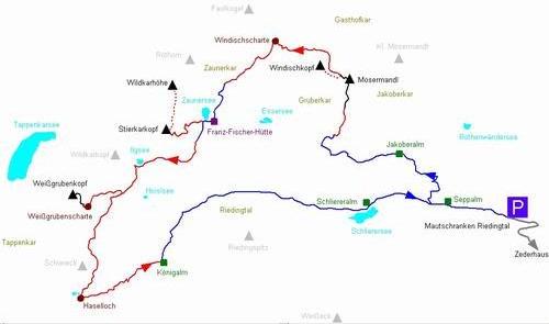| Routenverlauf: Start beim geschlossenen Mautschranken ins Riedingtal - kurz nach der Seppalm nach rechts zur Jakoberalm abbiegen - weiter Richtung Franz-Fischer-Hütte - nach rechts zum Mosermandl-Südanstieg - Mosermandl - Nordrinne - Windischkopf - Gasthofkar - Windischscharte - hinunter zur Franz-Fischer-Hütte am Zaunersee - Aufstieg zum Stierkarkopf und weglos weiter zur Wildkarhöhe - Abstieg und Weiterweg zur Weißgrubenscharte - Weißgrubenkopf - Zurück zur Gabelung Weißgrubenscharte / Hasenloch - Richtung Süden zum Haselloch - Abstieg zur Königalm und auf der asphaltierten Riedingtal-Straße bei etlichen Almen (u.a. Schliereralm am Schlierersee) zurück zum Mautschranken |