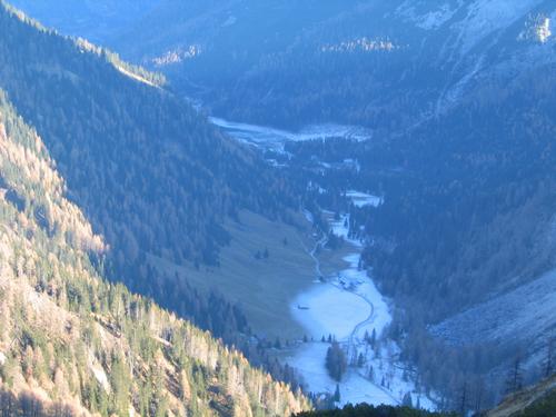 | Blick hinab ins Riedingtal - jene Stellen, wo die Sonne nicht mehr hinlangt, sind von dickem Reif überzogen |