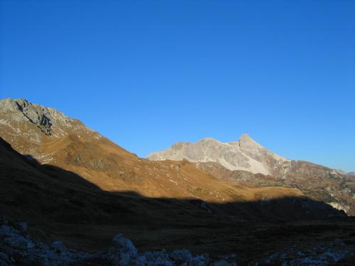 | Während ich im zunehmend frostiger werdenden Schatten wandere, liegt das Mosermandl weit hinter mir noch immer in der Sonne. |