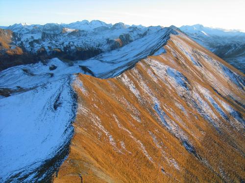 | Die letzten Sonnenstrahlen - aus der Weißgrubenscharte kann man unmarkiert den Grat über das Schiereck (hinten) entlangwandern und dann beim Hasenloch absteigen. Auf Grund der später rasch einsetzenden Dunkelheit wähle ich aber den markierten Weg weiter unten (links über die Schneefelder) zum Hasenloch. |