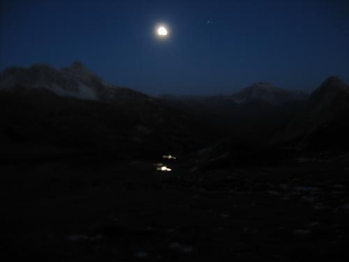 | Der Mond wirft lange, gut erkennbare Schatten und spiegelt sich in den zahlreichen vereisten Seen und Lacken. Ich muß meine Stirnlampe nur im oberen noch schwierigen Wegteil aktivieren. Die letzten 1,5 Stunden durch´s Riedingtal reicht das Mondlicht vollends aus. |