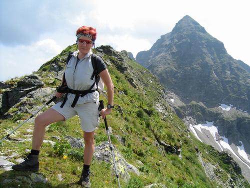| Unser ursprüngliches Ziel - den Obersee - ohnehin bei weitem überschritten - und für diese Höhe mit Kleidung und Jause und Getränken nicht optimal ausgerüstet, begnügen wir uns mit der Kleinen Wildstelle - im Hintergrund der steile Gipfelaufbau der Hochwildstelle |
