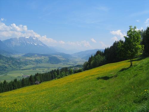 Auffahrt auf den Pruggererberg - Tiefblick Richtung Osten ins Ennstal - links der Grimming