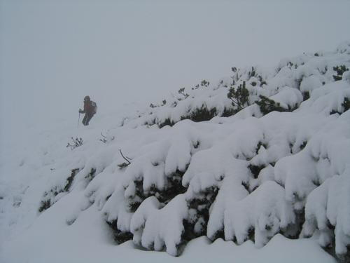 Beim Abstieg - endlich wieder in sicherem Gelände - Schneehöhe ca. 10 bis 15 cm