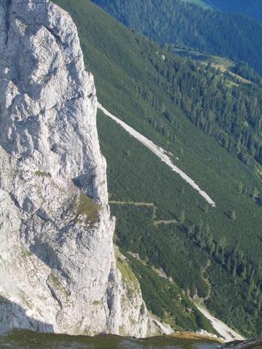 Blick hinunter zum Aufstieg Richtung Hochthronleiter durch die Latschenfelder hindurch