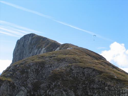 | Die Fieberhörndl von Norden gesehen - harmlos erscheinende "Grashügel" - darüber dreht gerade ein Paragleiter seine Kurven |
