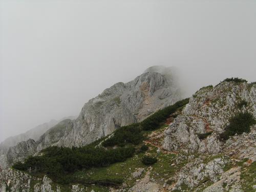 Aufstieg über den Westgrat zum Gipfel, der hier vom Nebel verdeckt wird