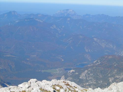 Tiefblick zum Almsee mit den umliegenden, herbstlich gefärbten Wäldern
