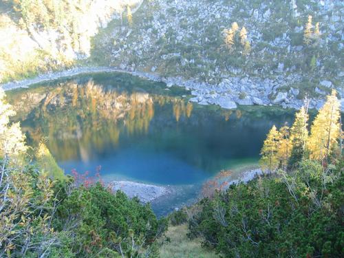 | Vorbei am Hinteren Lahngangsee, der nur an einer kurzen Wegstelle so schön sichtbar ist und meist hinter dichten Büschen verborgen bleibt. |