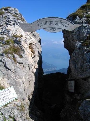 Bei der Himmelspforte. Ein Schild warnt vor einem Felssturz auf der Nordseite. |