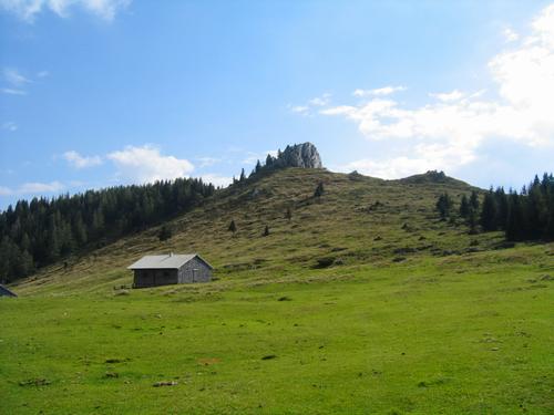 | Kräftiges Grün auf der Vormaueralm. Darüber der kurze Felsaufbau des Vormauerstein |