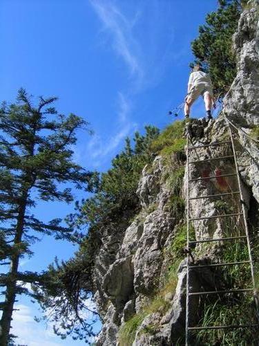 Auf den letzten 100 Höhenmetern wird es etwas ausgesetzter. Die schwierigsten Stellen sind durch 4 Leitern und einige Drahtseile entschärft
