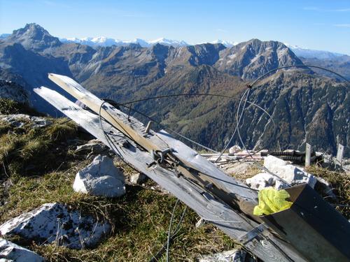 | Das Gipfelkreuz am Schwarzkopf liegt zur Zeit in Einzelteilen zerlegt am Boden - aber das Betonfundament für ein neues Kreuz ist bereits gelegt |