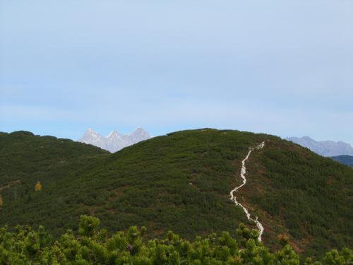| Der Weg zum Strimskogel führt von der Stubhöhe über Leckriedel und einige andere namenlose "Hügel" durch dichten Latschenwald |