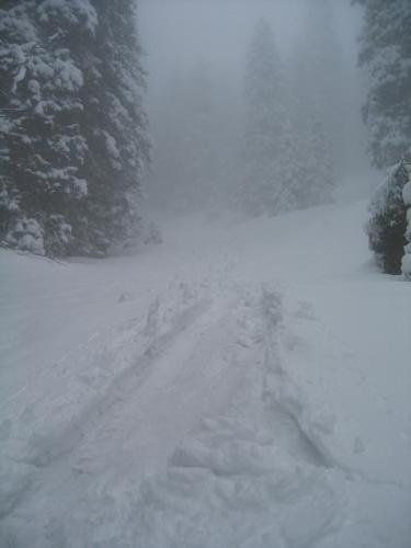 | Gewolltes Abrutschen in einer langen steilen Südwest-Rinne durch den Wald - es war einfach zu schön, so daß ich zu weit nach Westen kam - die Folge: wieder 60 Höhenmeter aufsteigen |
