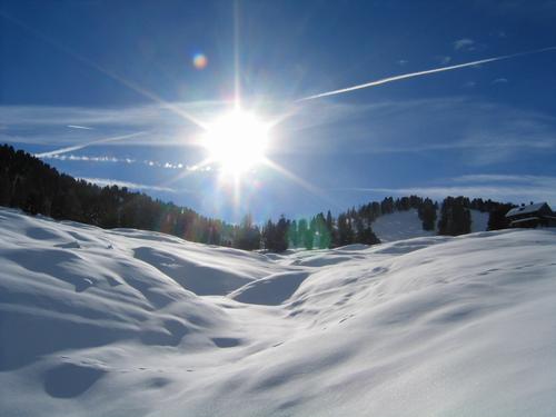 Tiefwinterlich verschneite Hügel am Weg zur Brünnerhütte (rechts oben)