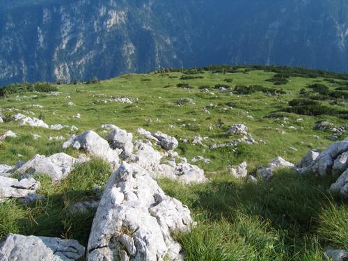 | Beim Südabstieg zum Kühboden geht es vorerst über eine idyllische, von der Spätnachmittagssonne beschienenen Wiese. Ein Paradies für mindestens 50 Gämse, die ich leider durch mein Erscheinen aufgeschreckt habe ... |