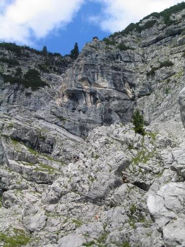 | Der Einstieg in den Teufelssteig erfolgt aus den Schotterfeldern auf der Südseite. Der Steig verläuft etwas links der Bildmitte. |