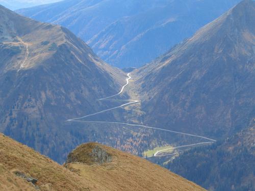 Blick nach Süden zur Straße, die sich über den Sölkpaß windet. Im Vordergrund der Gratrücken, über den man zur Unholdingspitze aufsteigt