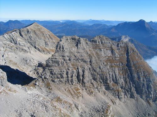 Blick nach Norden zum Ramesch, der südlich vom Frauenkar und nördlich vom Brunnsteiner Kar abgegrenzt wird. Links im Hintergrund der Gipfel des Toten Mann. |