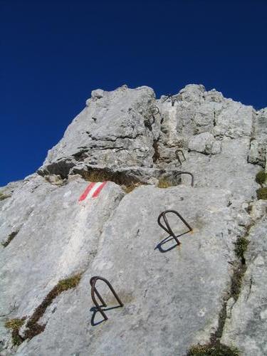 Am Südostgrat gibt es viele leichte Griffe und Tritte. Über einige senkrechte, glattere Platten helfen Stahlbügel hinweg. |
