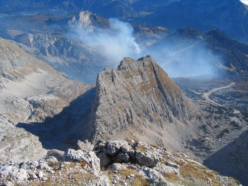 Tiefblick zum markanten Ramesch - im Hintergrund erkennt man die Feuer, deren Rauchgestank 1.000 Höhenmeter bis zum Warscheneck heraufgeweht wurde. |