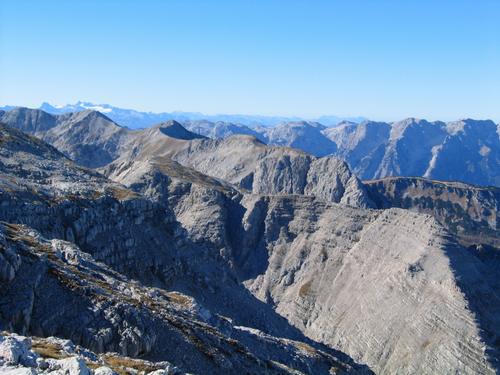 Blick nach Westen - links ganz im Hintergrund liegt der Dachstein. Weiter vorne zieht sich die Bergkette von den "Mölbingen" bis zum Schrocken - Siehe auch Tour vom 25.10.2004 |