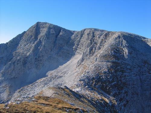 Blick zurück zum Warscheneck - auch der Normalweg ist als SCHWARZ gekennzeichnet. Etwas heikel ist der Abstieg über diesen steilen Rücken auf der rechten Bildseite. |