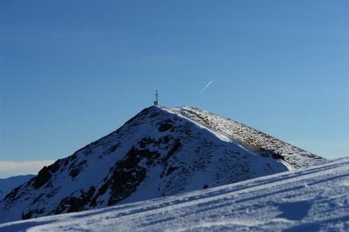 Blick vom Kleinen zum Großen Bärneck, wo gerade ein Schiwanderer beim Gipfelkreuz angekommen ist.