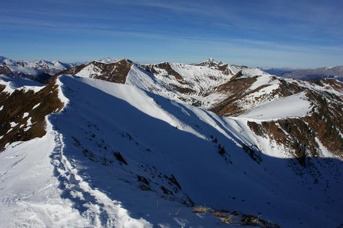 | Vom Gr. Bärneck kann ich meinen weiteren Tourenverlauf gut überblicken: Zuerst wieder am Grat zurück zum Kleinen Bärneck (links). Danach hinunter nach rechts zur Gstemmerscharte und weiter in stetigem Auf und Ab über die Gipfelparade von Sonntagskarspitz und Schwarzkarspitz. Ganz hinten führt der Weg dann aus der Mößnascharte hinauf zum Pleßnitzenkopf. |