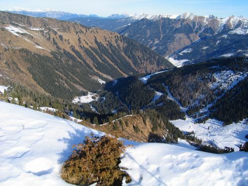 | ... und nach Norden Richtung Donnersbachwald - bei der Schneefläche im rechten oberen Eck. Links der Bildmitte die Vordere Mörsbachalm mit der Mörsbachhütte. Rechts unten die Hintere Mörsbachalm ... |