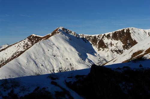 | Und noch einmal das Gaßeneck - diesmal beim Aufstieg Richtung Kleines Bärneck. Die direkt der Sonne zugewandten Hänge sind überwiegend aper. |