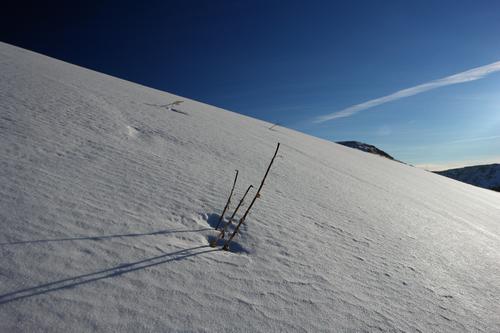 | Gelegentlich sind Schispuren auf den ganz brauchbaren Schneehängen erkennbar - meist aber geht es über unberührtes Terrain. |