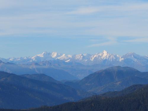 | ... und zu den markanten Gipfeln von Großglockner (links) und Gr. Wiesbachhorn (rechts) in den Hohen Tauern. Genau dazwischen erkennen kundige Wanderer die Gratschneide der Hohen Dock (3.348), auf der ich am 23.09.2006 eine ganz ausgezeichnete und hervorragende Tour erleben durfte. |