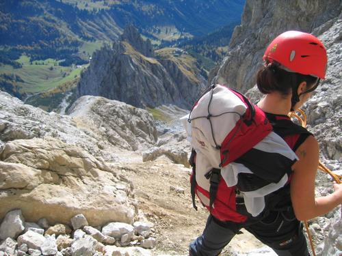 | Und schließlich ist es so weit. Unser "erstes Mal" - Ingrid und ich hängen erstmals am Seil, welches natürlich große Sicherheit gibt - aber raufkommen muß man trotzdem aus eigener Kraft. Und bereits hier erweisen uns die Helme wertvolle Dienste, als einige Steinchen pfeiffend die Schlucht herunterzischen. Wie uns Bettina bereits vorher aufgeklärt hat, sollte man beim Ruf "Vorsicht Stein" tunlichst nicht nach oben blicken. |