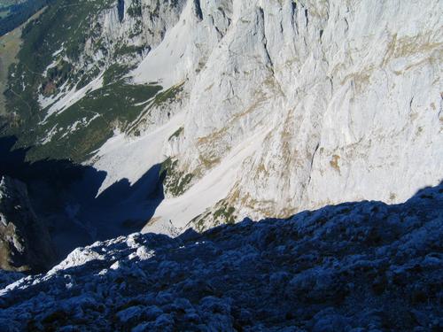| Und schließlich ist das Gipfeldach fast erreicht, von wo man das Gipfelkreuz bereits erkennen kann. Der Schwierigkeitsgrad bewegt sich hier bei I+ bis II-. Tief geht es auf der großteils im Schatten liegenden Nordwestseite hinunter. |
