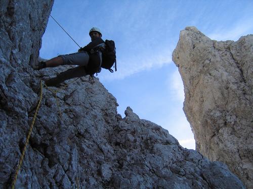 | Und schließlich ist es auch bei uns soweit: Anfangs noch sehr "gewöhnungsbedürftig" und mit zugegebenermaßen leicht mulmigem Gefühl gehen wir ans Werk. Helmut läßt Ingrid und mich gleichzeitig hinunter - meine Frage, als Ingrid und ich gerade in der Luft hingen, ob das Seil das überhaupt aushalte, meinte er nur: "Do miaß ma hiaz eh erscht amoi schaun". In souveränem Stil kommt er schließlich als Letzter nach. |