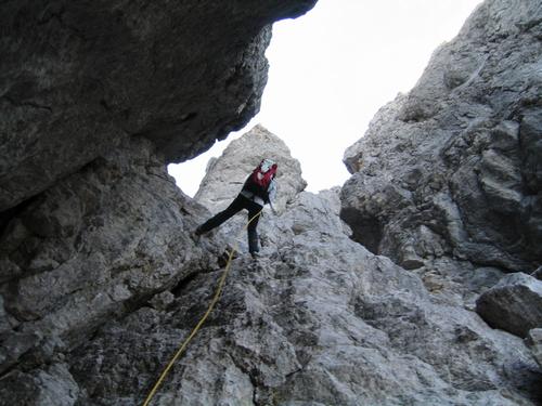 | Und hier über die IIIer Stellen sind wir mehr als froh über die Möglichkeit des Abseilens. Bettina in Action. Gekonnt und mit sichtlich viel Freude läßt sie sich hinunter - eine wahre "Lady on the rocks". |
