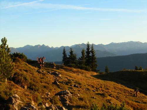 | Unweit der Hofpürglhütte treffen Helmut und Bettina (links), die etwas schneller unterwegs sind als wir und deshalb vorausgehen, auf Martin (rechts im Bild), der von der Gr. Bischofsmütze wieder in eindrucksvollem Eilzugtempo und ohne Sicherung abgestiegen ist und noch schnell den Kamplbrunnspitz mitgenommen hat. Die 3 steigen schließlich gemeinsam zu den Hofalmen ab. |