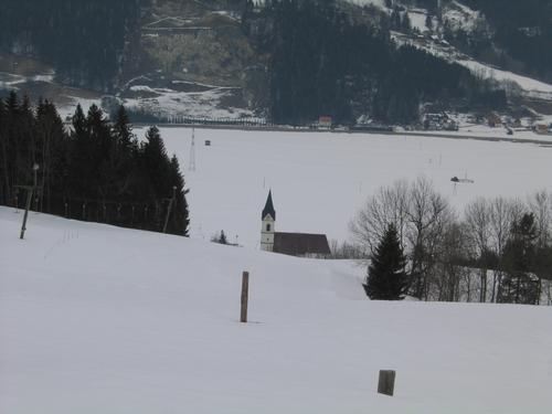 | Kurz nach dem Start oberhalb der Kirche in Lassing. Aufstieg neben einem (zumindest heute) stillgelegten Schlepplift bis zur Waldgrenze. |