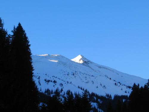 | In eisiger Kälte am langen, ziemlich flachen Weg von den Gulling-Jagdhütten in die Schwarzgulling. Mein Aufstieg wird mich durch den Wald und über die Schneehänge in die Sonne zum Kreuzkogel hinauf führen. |