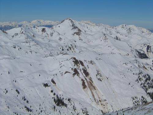 | Blick nach Norden zum markanten Hochrettelstein. Im Vordergrund viele Grundlawinenabgänge vom Kamm der sich vom Brennkogel (rechts) zum im Bild nicht ersichtlichen Hintergullingspitz (links) zieht. |
