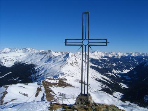 | Das Gipfelkreuz am Kreuzkogel. Mein Aufstieg erfolgte aus dem Tal ganz hinten links - meine Abfahrt wird nach rechts in das Tal Richtung Brettstein erfolgen. Von der Gamperhütte werde ich schließlich in die Scharte zwischen Seitnerzinken (links) und Schrattnerkogel (rechts) wieder aufsteigen, und von dort beide Gipfel "in Angriff nehmen". |