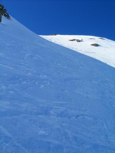 | Abfahrt am stellenweise 40 Grad steilen Osthang vom Kreuzkogel. Der Hang ist gottseidank nicht pickelhart, so dass ich in unelegantem weitem Hin- und Herfahren sturzfrei hinunterkomme. |