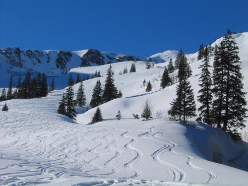| Irgendwo zwischen Gamperhütte und Schwabergeralm. Erstaunlicherweise findet man auch hier noch Fleckerln, wo man seine eigenen Spuren ziehen kann. Großteils gibt es hier noch Pulver - gemeinerweise immer wieder von überraschend auftretendem Bruchharsch unterbrochen. |