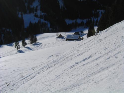 | Von der Gamperhütte steige ich einen steilen Hang zu einer Forsstraße hinauf, die ich bis zur Baumgrenze beschreite. |
