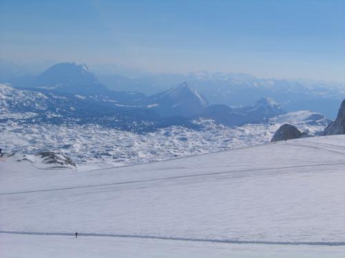 | Wir aber wählen den wesentlich ruhigeren Weg östlich des Gjaidstein über die größte Karsthochfläche Österreichs Richtung Gröbming. Im Hintergrund Grimming, Kammspitz und Stoderzinken (v.l.n.r. mit abnehmender Höhe). Zwischen den beiden letztgenannten werden wir nach Gröbming-Winkl abfahren. |