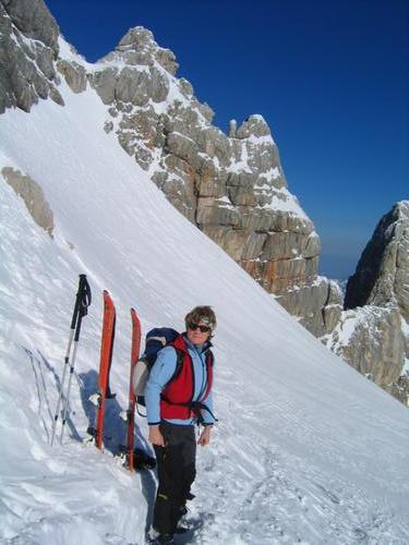 Ingrid knapp unterhalb des Klettereinstieges am Hohen Dachstein.